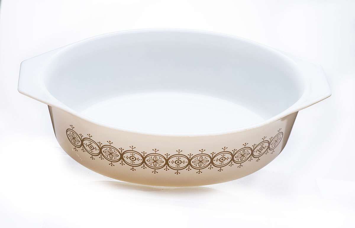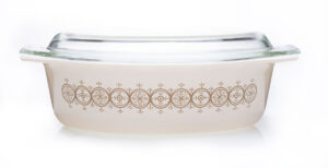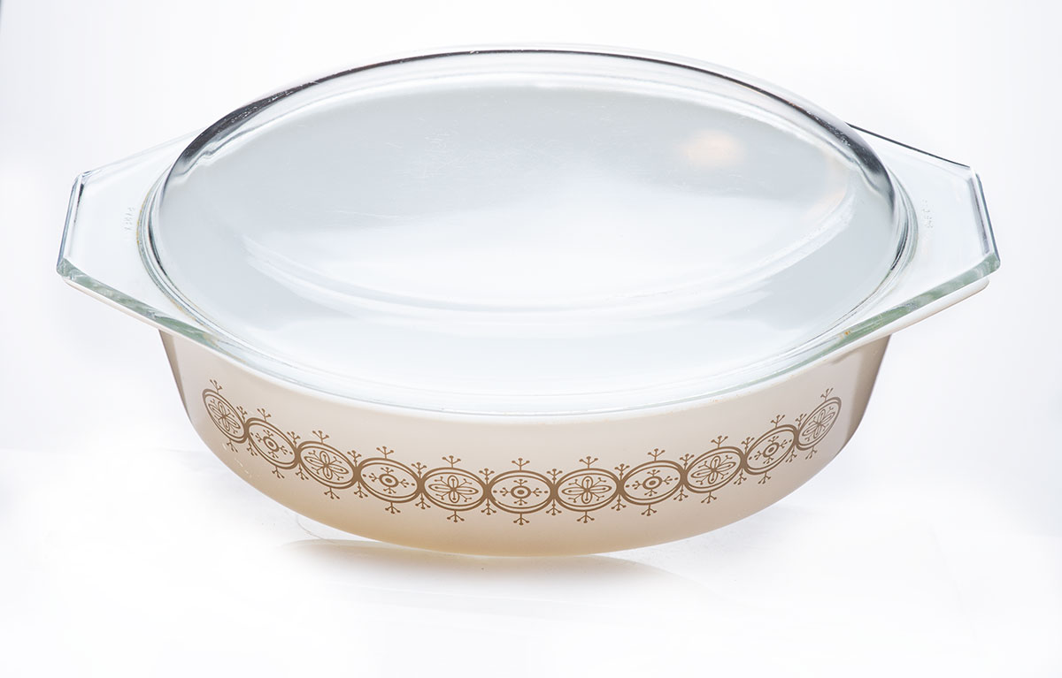 Vintage Pyrex Gold Medallion Casserole Dish # 045 with lid and carrier. 2-1/2 qt
